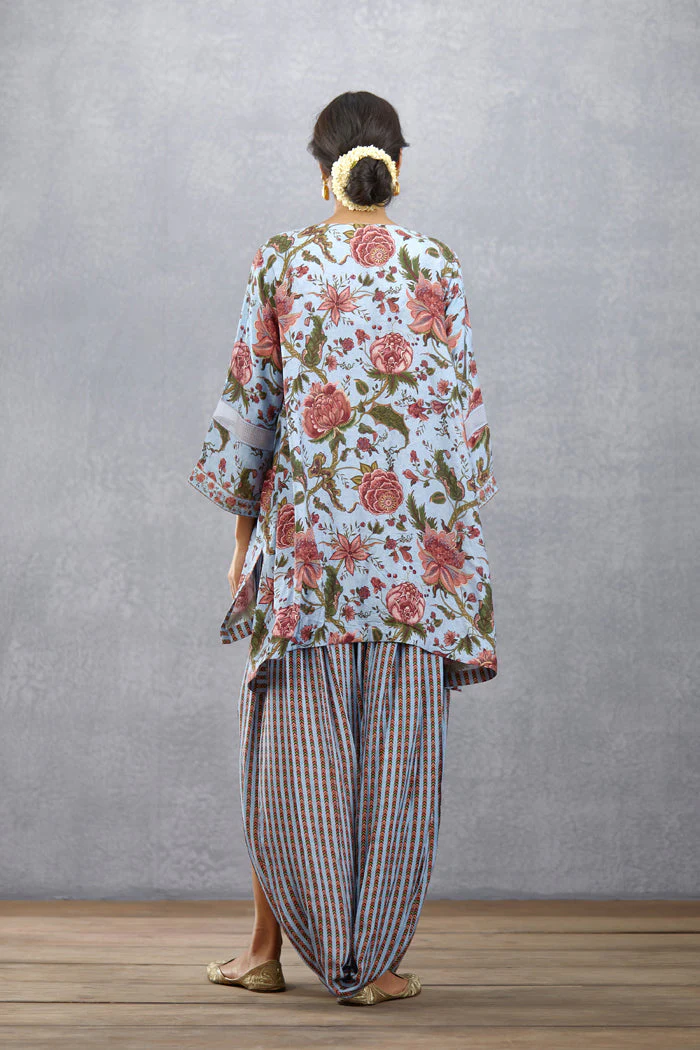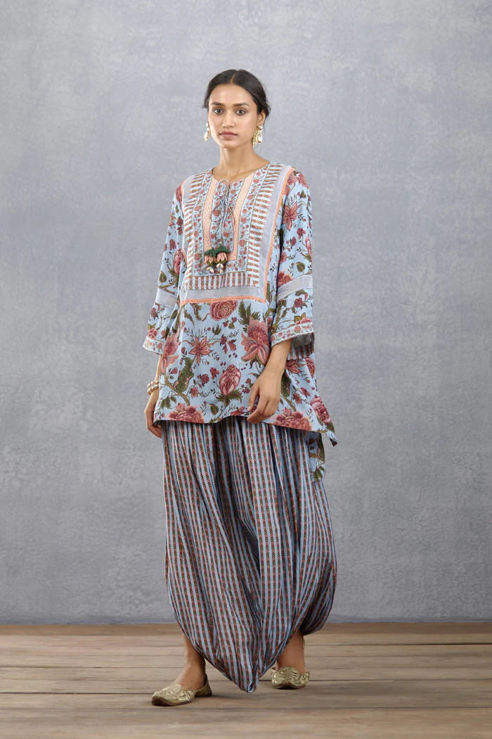 The Samsara Iyana Co-ord Set is beautifully crafted for daily wear. Made with quality cotton silk fabric, the set features a sea blue chintz printed kameez kurta and dhoti pants for a comfortable fit. The unique digital print adds a touch of vibrancy to your wardrobe. Look chic and stylish in this set.