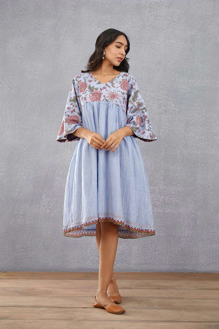 Our Samsara Lolita Dress is a contemporary masterpiece. Crafted in a combination of handwoven thin chanderi and cotton silk fabrics, this sea blue quilted dress features intricate quilting and a digital print. Make a statement in this modern take on a timeless wardrobe staple.