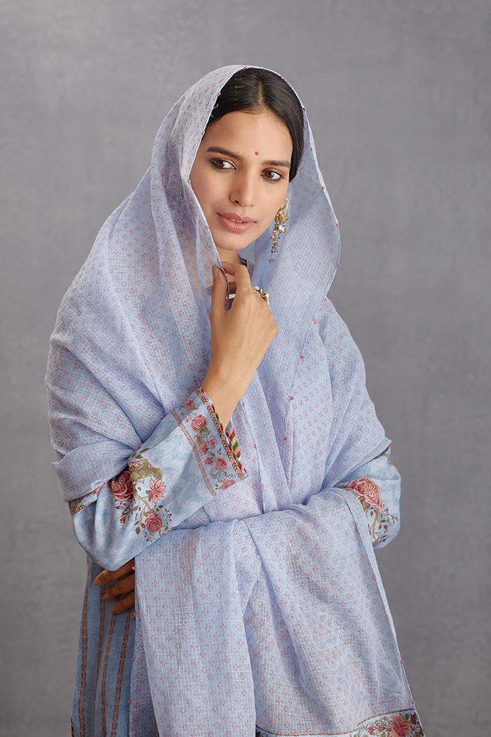 Experience effortless elegance with this Samsara Samar Odhni. Made with Cotton Kota and featuring a combination of Digital print, Hand Block print, Hand embroidery, and Hand work, this blue Odhni will add a hint of sophistication to your wardrobe. The embroidered Silk Organza panel adds the perfect touch of modern design.
