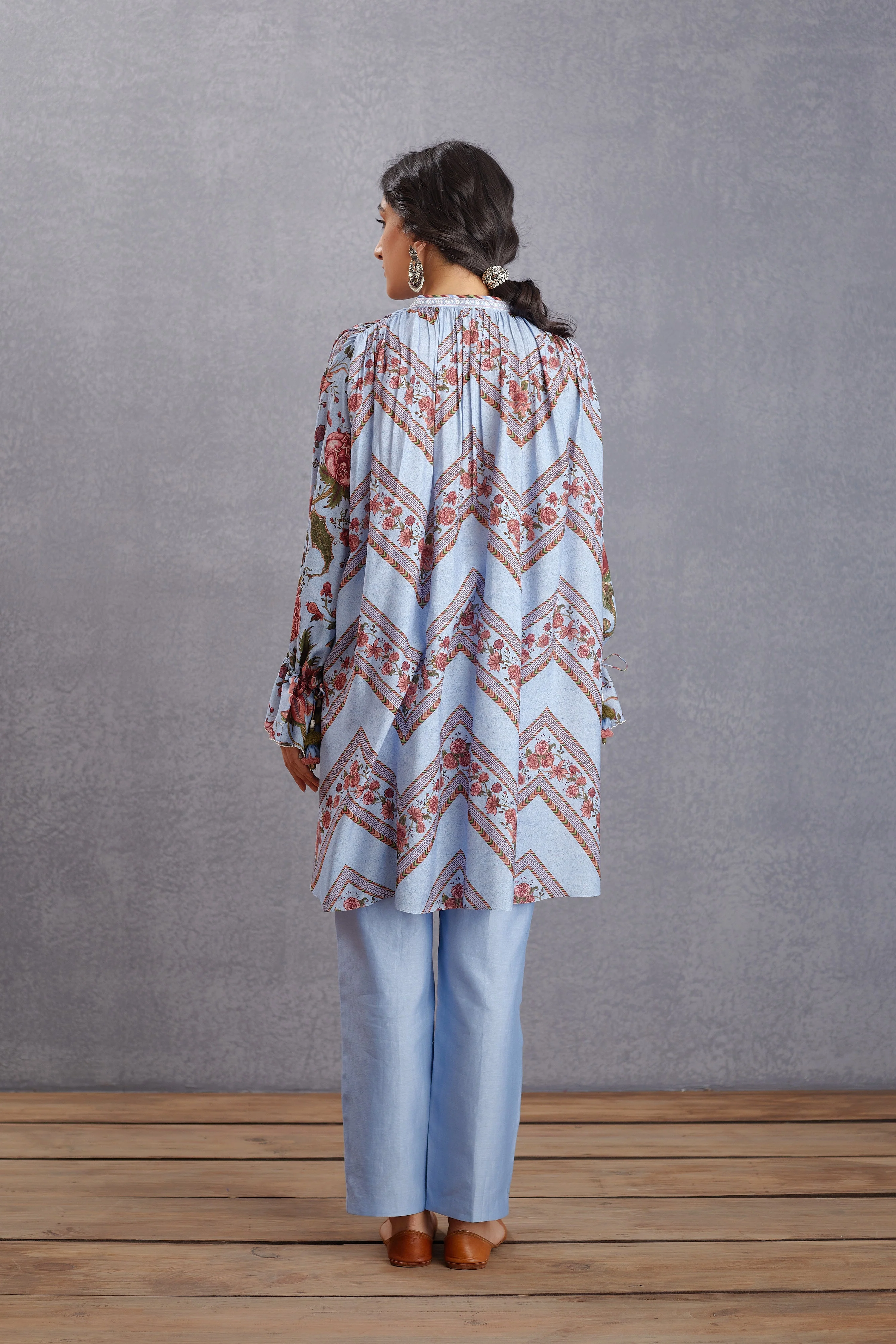 Look stunning in our Samsara Taarifa Co-ord Set. Made with cotton silk for the kurta and handwoven chanderi and cotton voile for the pants, this set is decorated with digital print, aari embroidery, and hand work for a beautiful and unique look. Perfect for any special occasion.