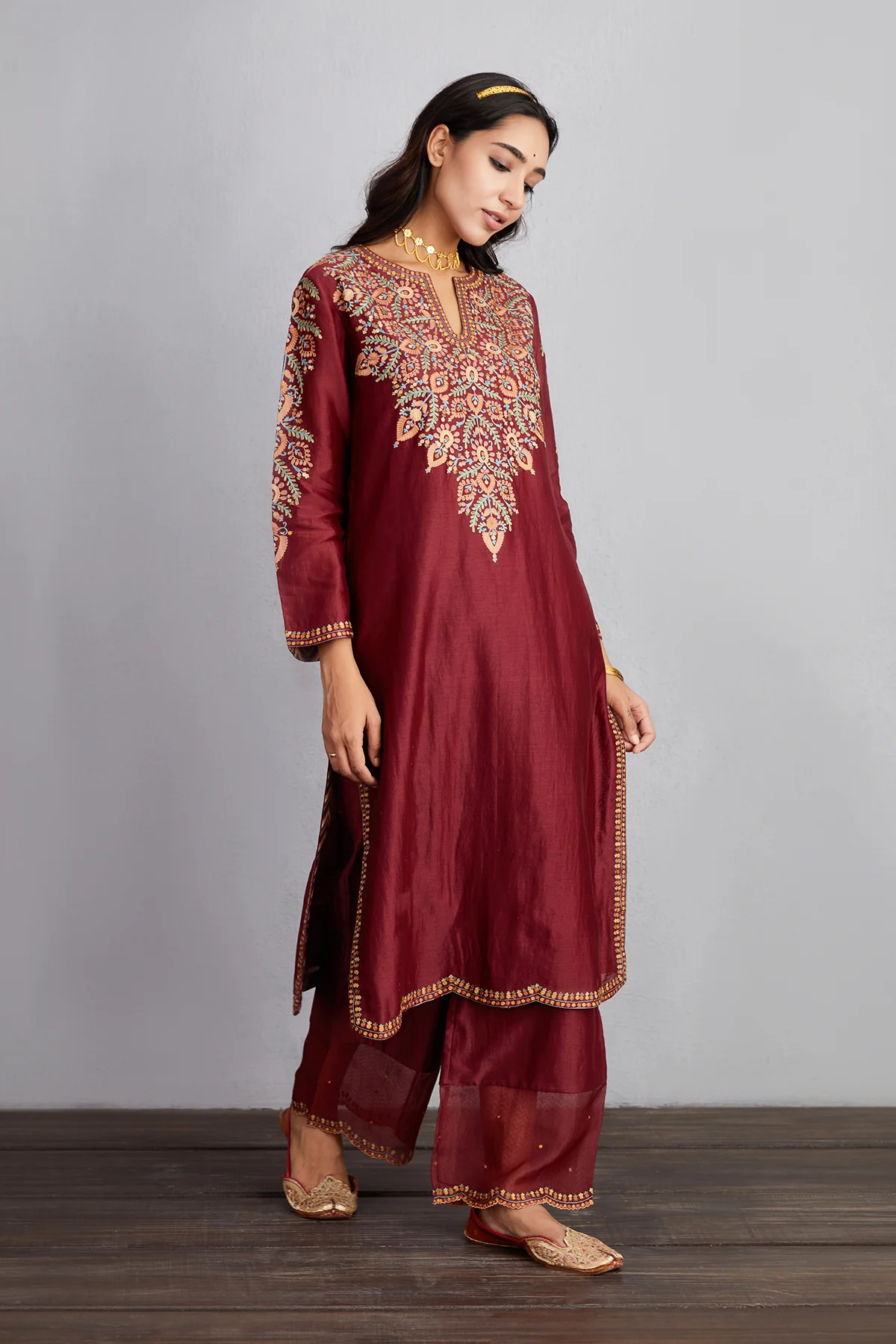 The Sanobar Sehmat Kurta Set in garnet red is a striking combination of handwoven Chanderi, Silk Organza and Cotton Voile fabrics. This unique set is highlighted by beautiful Aari Embroidery. Enjoy this special ensemble with a Kurta, Pants and Odhni.