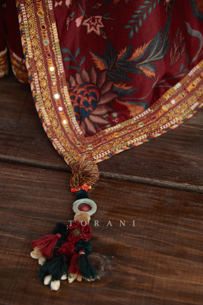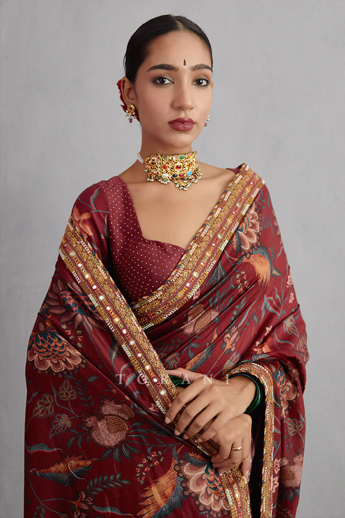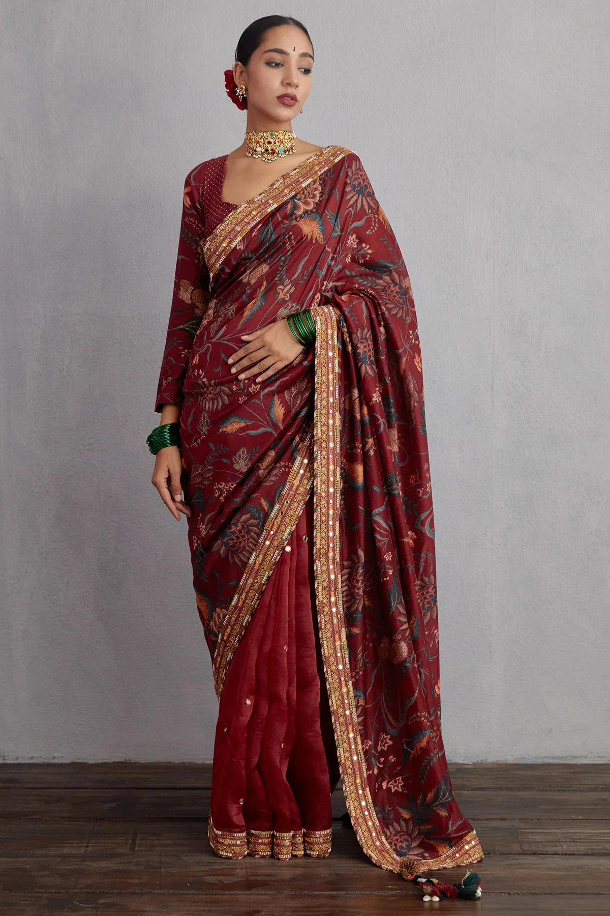 The Sanobar Sheesha Revathi Saree is expertly crafted with handwoven Chanderi and Silk Organza fabrics, complemented by hand embroidery, hand adda work, and digital print in a wine hue. Its intricate detailing and striking colour palette make it the perfect choice for those looking to complete a sophisticated ensemble.
