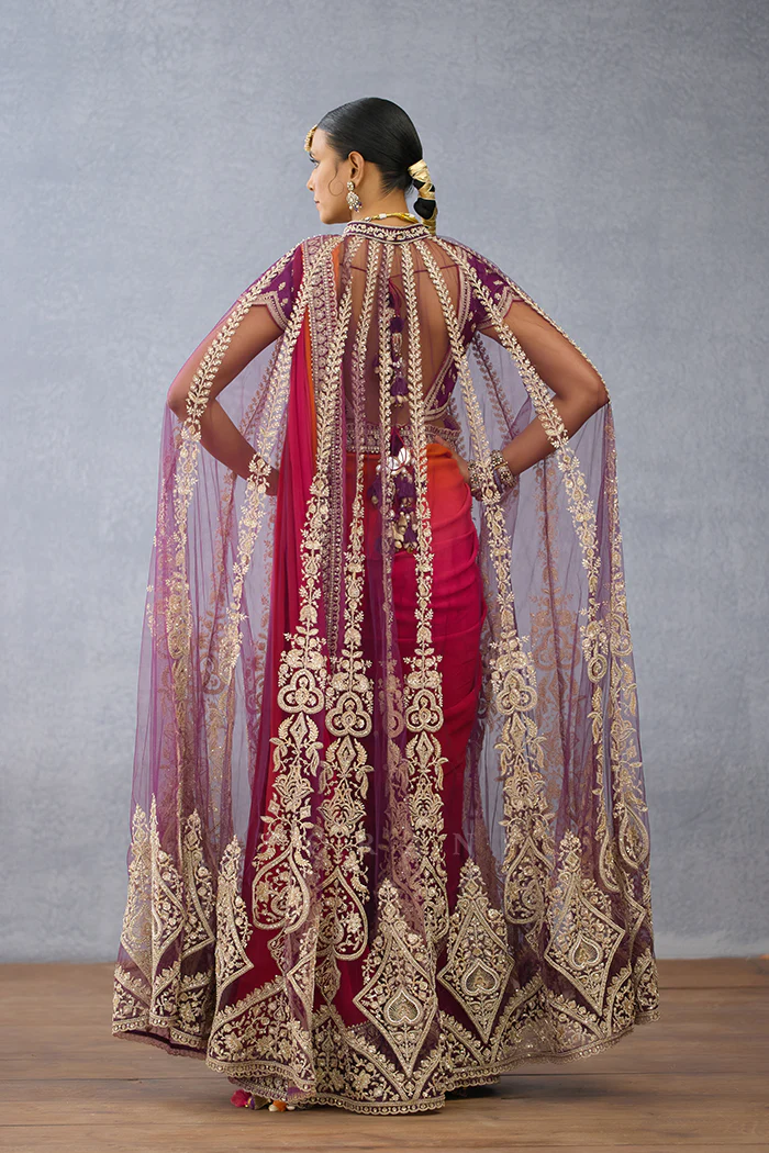 The Saroj Ismi Saree Set is an exclusive statement piece, styled by our ateliers to create an unmatched effect of royalty. Crafted from the finest jeni silk and butterfly net, and embellished with zari embroidery, it features unique detailing and a gorgeous ombre hue, making it a perfect addition to your wardrobe.