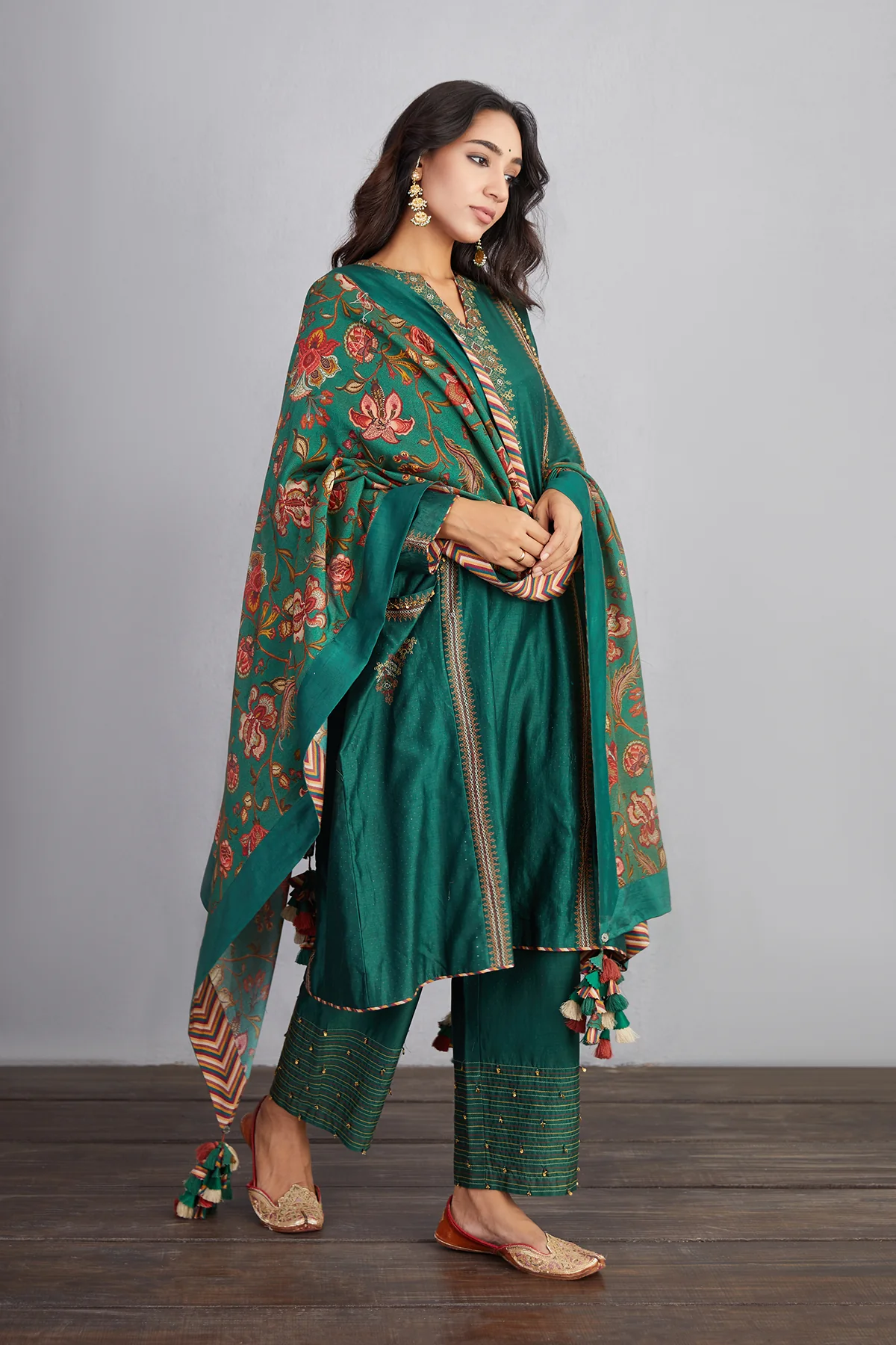 This beautiful Sheesham Kashish Kurta Set is crafted from luxurious handwoven Chanderi and Cotton Voile fabrics and is designed with a striking green colour. Flawlessly finished with exquisite hand embroidery and traditional hand block print, this set is sure to elevate any wardrobe with opulent style.