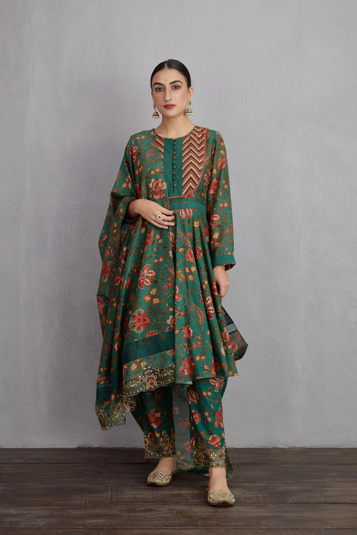 This Sheesham Saba Anarkali Kurta Set is crafted from handwoven Chanderi fabric in a striking green shade. It features Aari embroidery work, and includes a kurta, pants, and odhni for effortless party look. Perfect for special occasions.