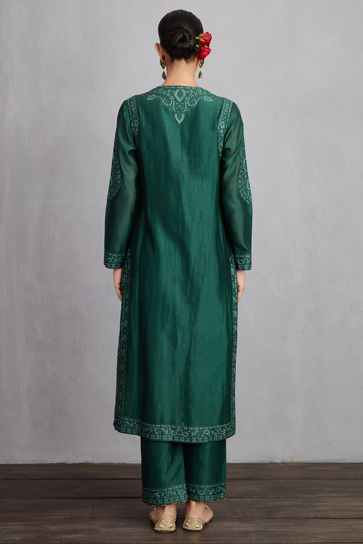 This stylish Sheesham Sahiba Co-ord Set is handwoven from a combination of Chanderi and Cotton Voile fabrics, giving it a unique soft texture. It features intricate Aari Embroidery in a classic green colour, for a traditional yet modern look.