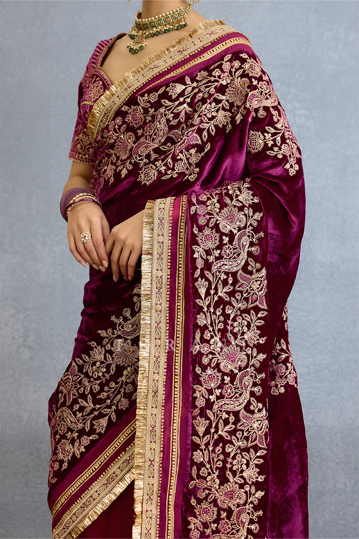 The Shehtooti Makhmal Yashoda Saree makes a sophisticated statement, with its combination of luxurious silk Velvet fabric, intricate hand embroidery, detailed dori embroidery, and hand adda work. The captivating Mulberry hue of the saree adds a perfect finishing touch.