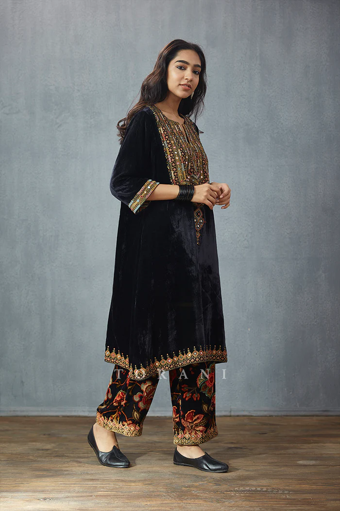 The Siyah Makhmal Paakizah Co-ord Set is a stunning silk velvet ensemble with a Siyahi jaal chintz pattern. The luxurious black color is accentuated with intricate hand and machine embroidery for a look of elegance and sophistication. Experience true couture-level comfort with this sophisticated kurta set.