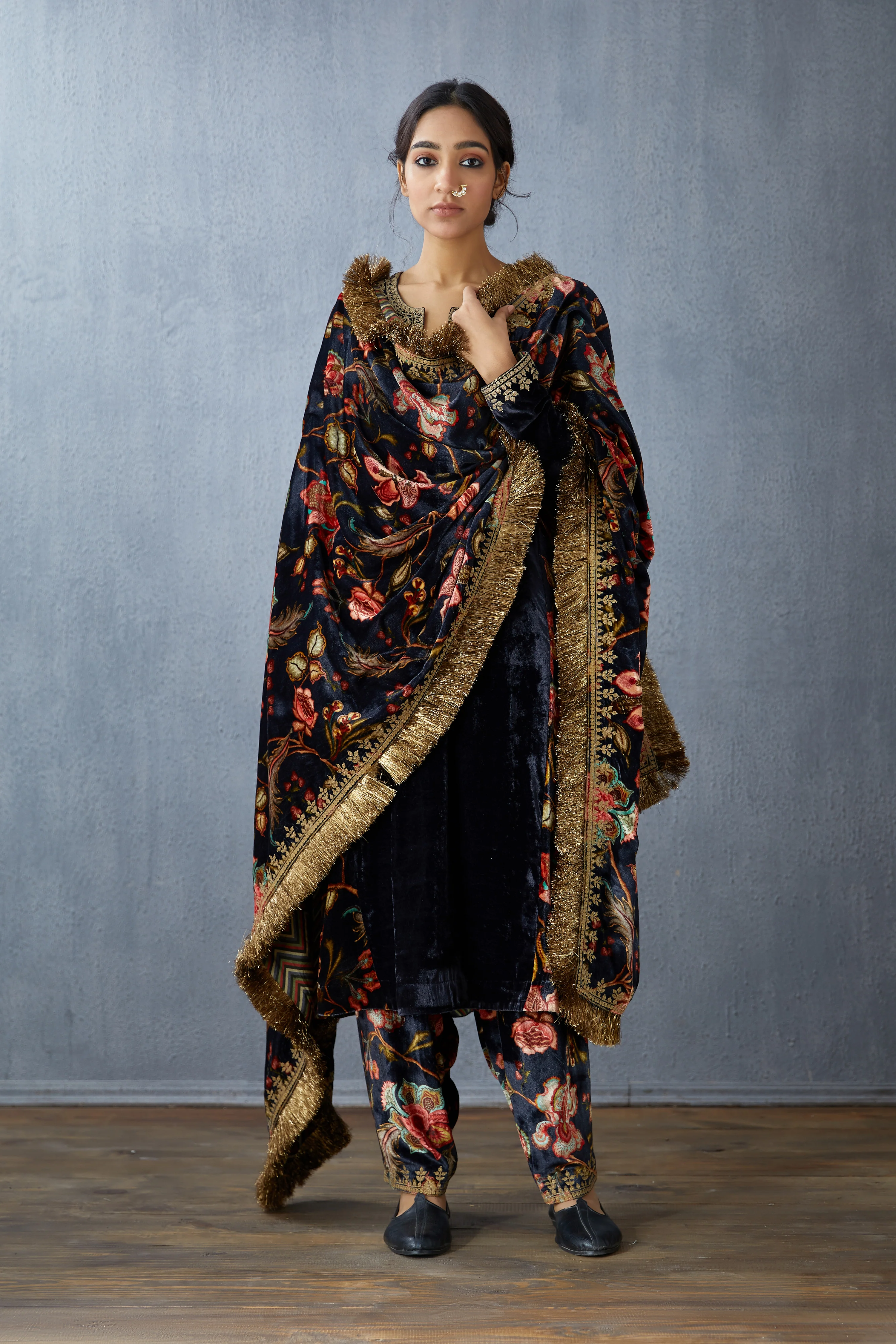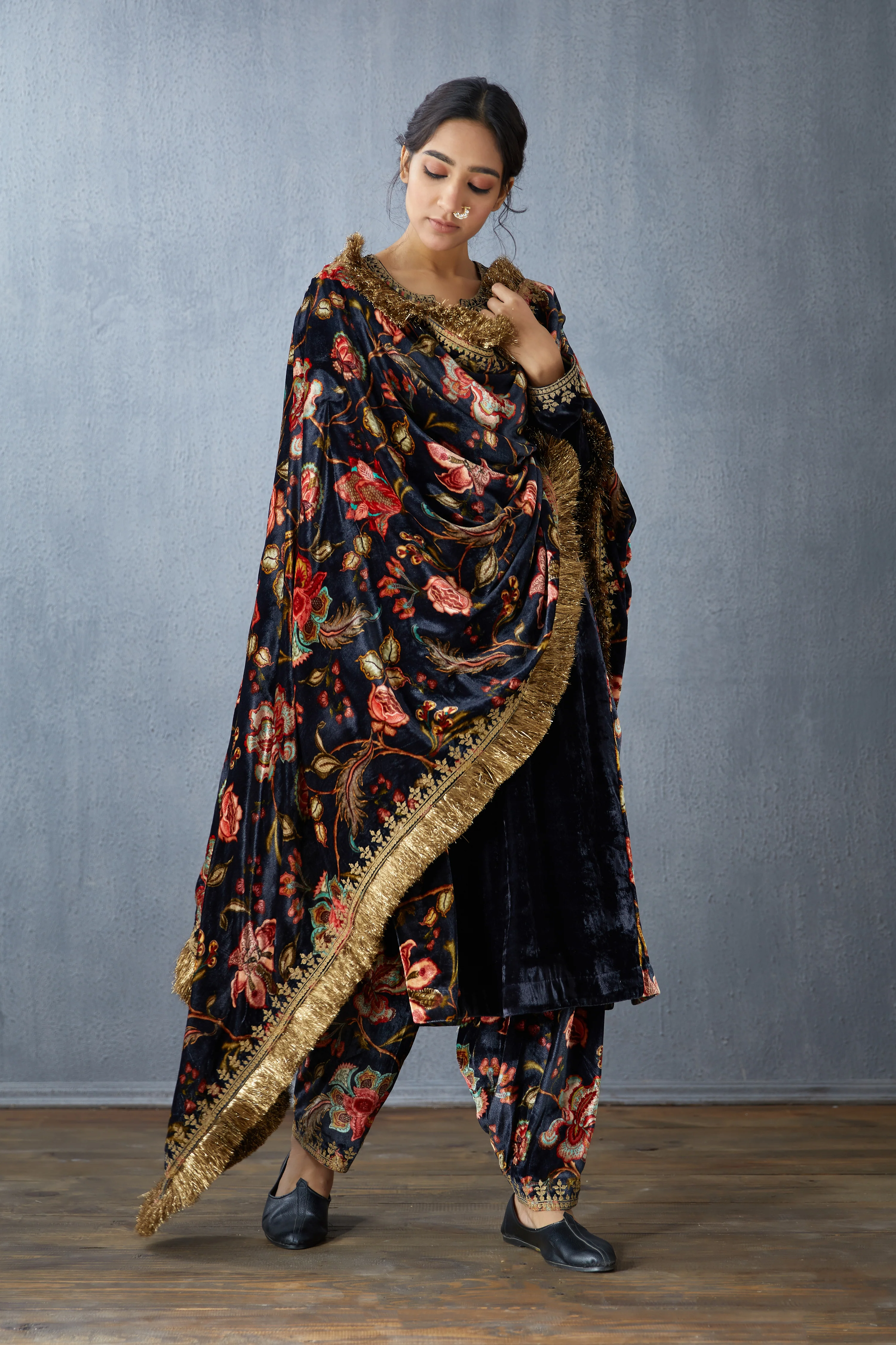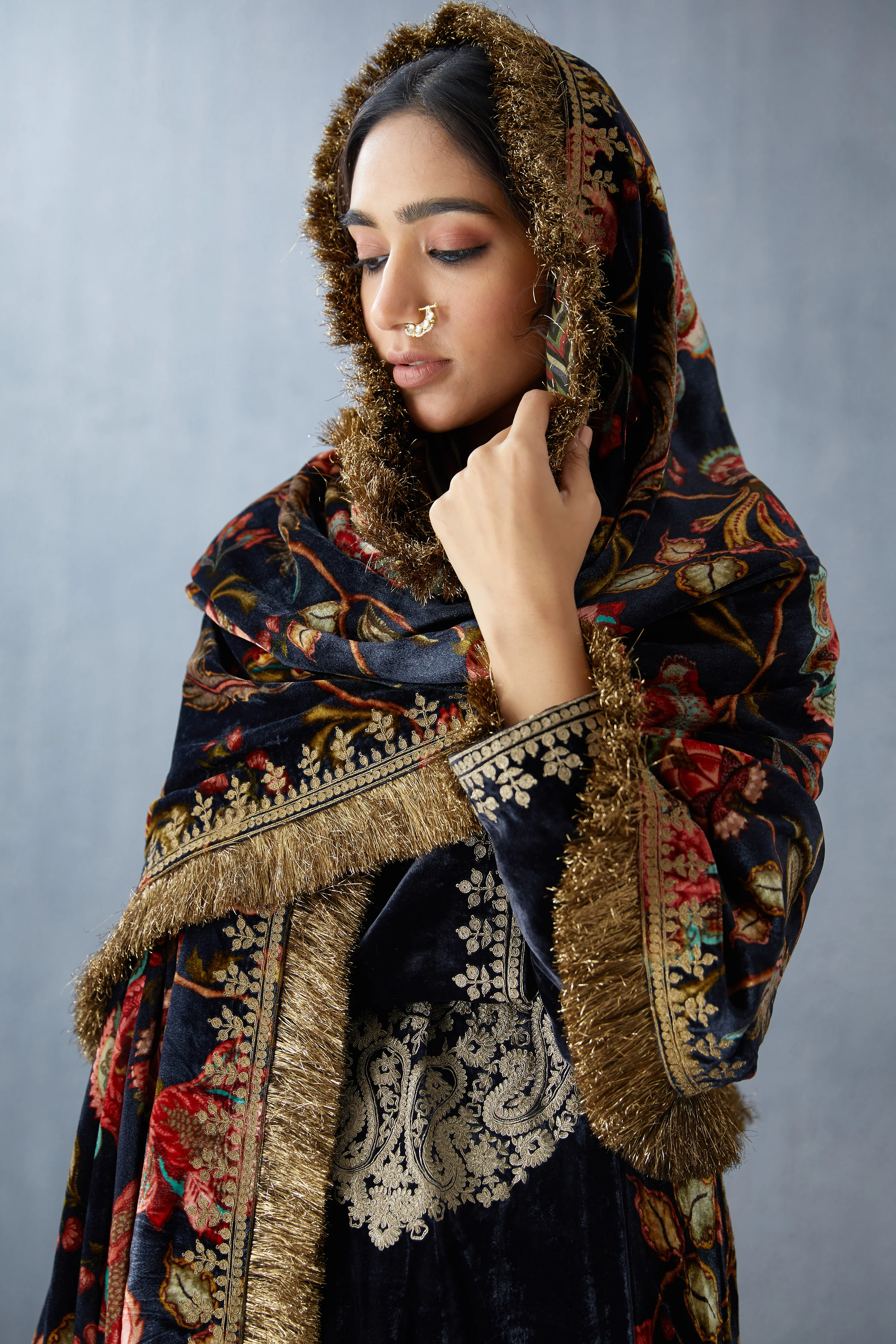 Designed with luxurious Silk Velvet, the Siyahi Aakifah Sona Jhallar Doshala is sure to turn heads. This Hand-embroidered piece features intricate detailing in a stunning geometric pattern, making it a truly unique and elegant accessory.