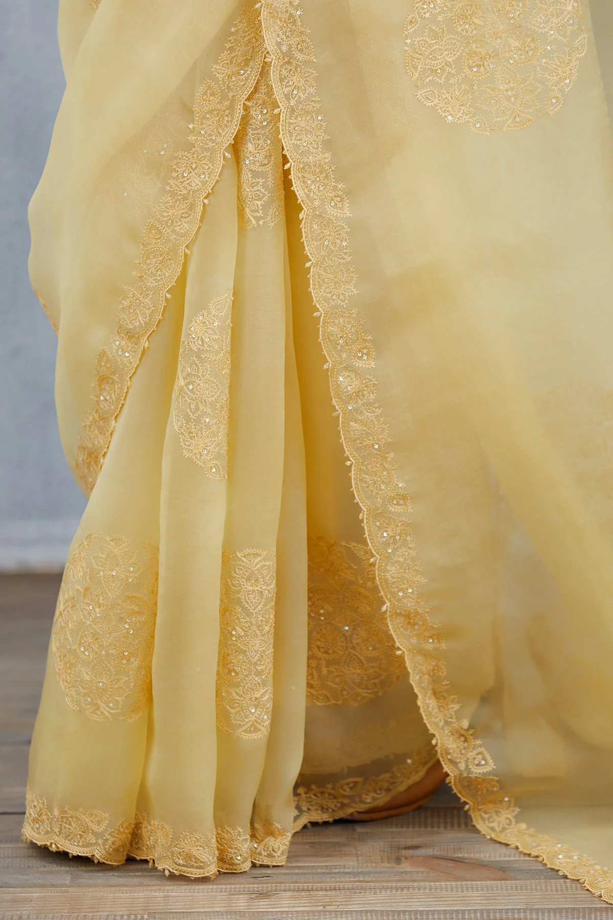 Be immersed in an aura of splendour with the Sunhera Aadira Saree. Crafted in silk organza, this luxurious saree features Aari Embroidery and Hand Adda Work for an unforgettable look. It comes in a refreshing yellow hue, making it perfect for special occasions.