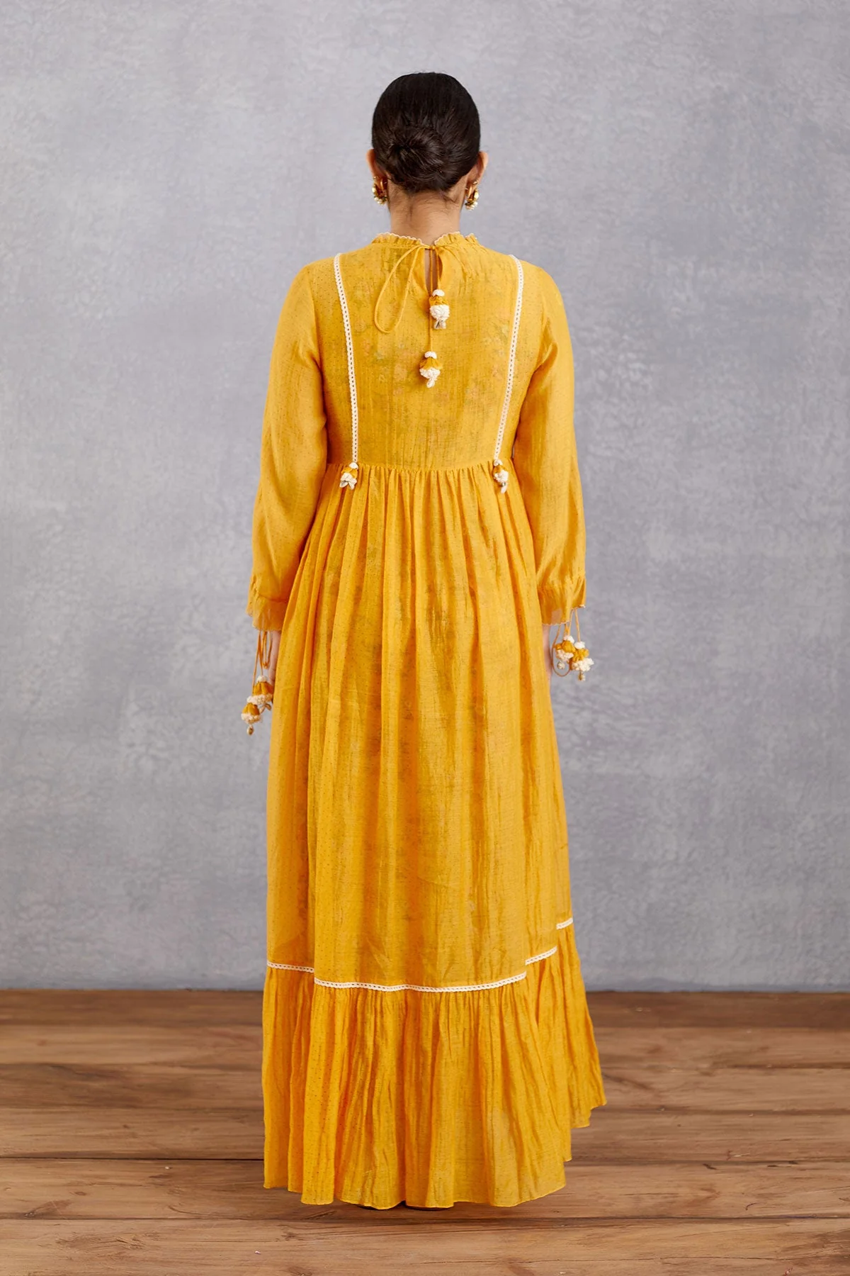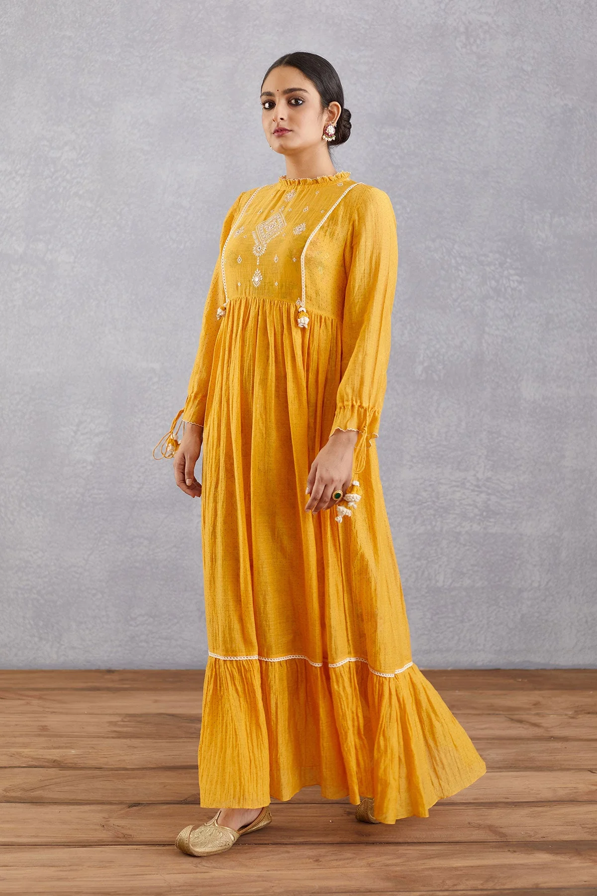 Stay graceful in the Sunehra Adeena Dress - a timeless classic crafted with delicate chanderi fabric and cotton silk slip. Adorned with a subtle topaz yellow hue, this elegant piece is sure to be a wardrobe staple.