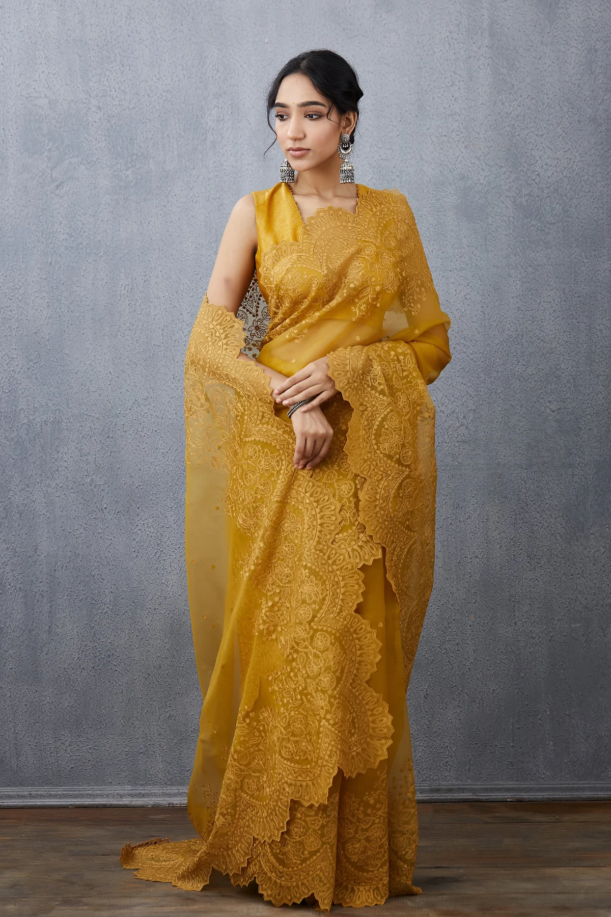 The elegant Sunehra Farrin Saree is sure to make a statement. Crafted from luxurious silk organza and featuring aari embroidery work, this saree exudes sophistication and style. Perfect for any special occasion, the Yellow color of this saree will add a touch of elegance to your look.