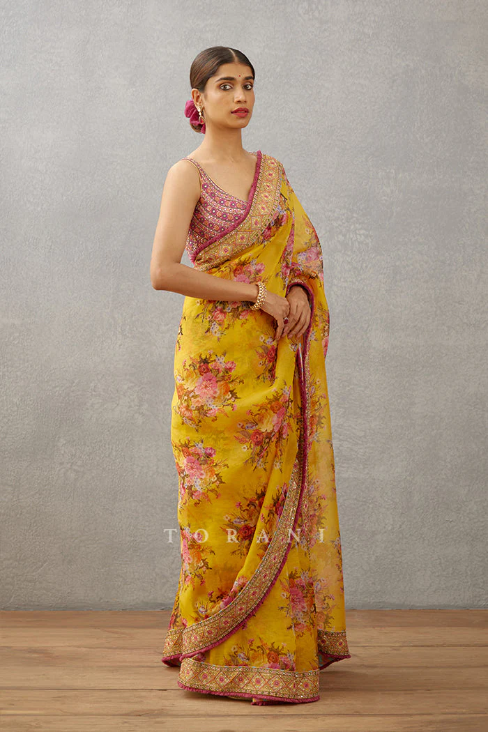 The Sunehra Zubaida Saree from Sindhi Tent House is a masterful blend of hand embroidery, hand adda work, and digital printing on luxurious silk organza. Crafted with precision, this striking yellow saree ensures comfort and unparalleled elegance for formal and special occasions.