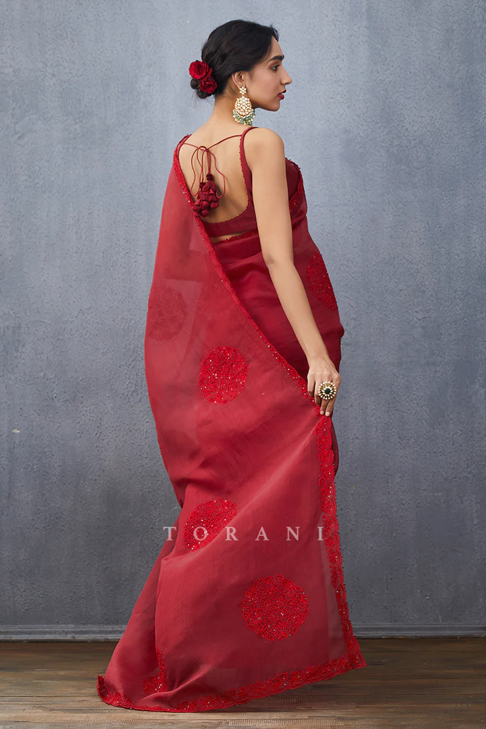 The Surkh Aadira Saree is made from luxurious silk organza, with intricate aari embroidery for an exquisite finish. Boasting a vibrant red hue, this saree is sure to turn heads and make a statement.