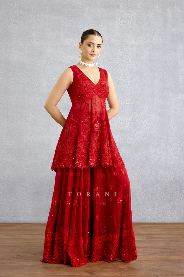 The Surkh Bhanavi Sharara Set is a beautiful ensemble that boasts a rich red hue. Crafted with a luxurious and lightweight georgette fabric, this set features a sleeveless peplum top, a flowy sharara and an odhni- all detailed with intricate hand and dori embroidery.