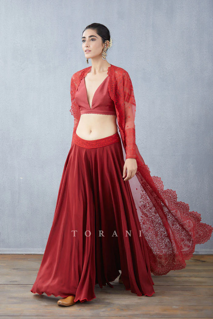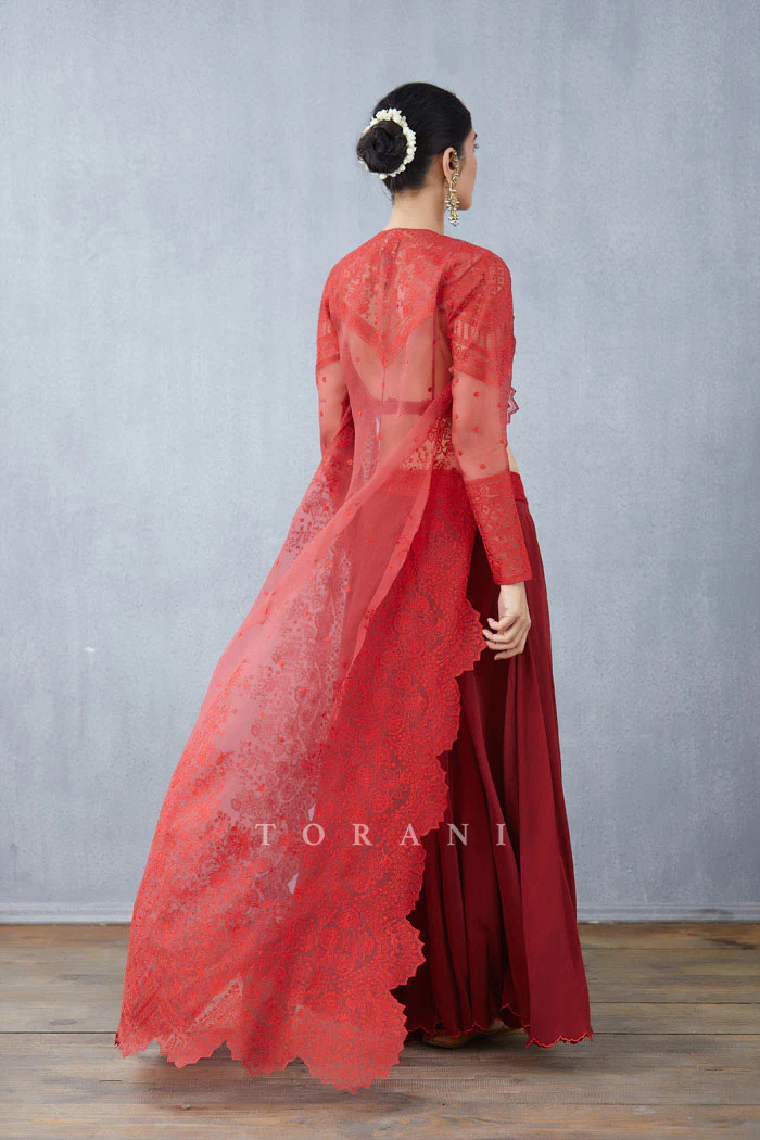 Stay stylish with this Surkh Daavya Cape Set! Crafted with Handwoven Chanderi, Silk Crepe, Silk Organza, and Cotton Silk fabrics in a striking red hue, this set features intricate Aari embroidery for a touch of elegance. Includes a Cape, Blouse, and Sharara for a complete look.