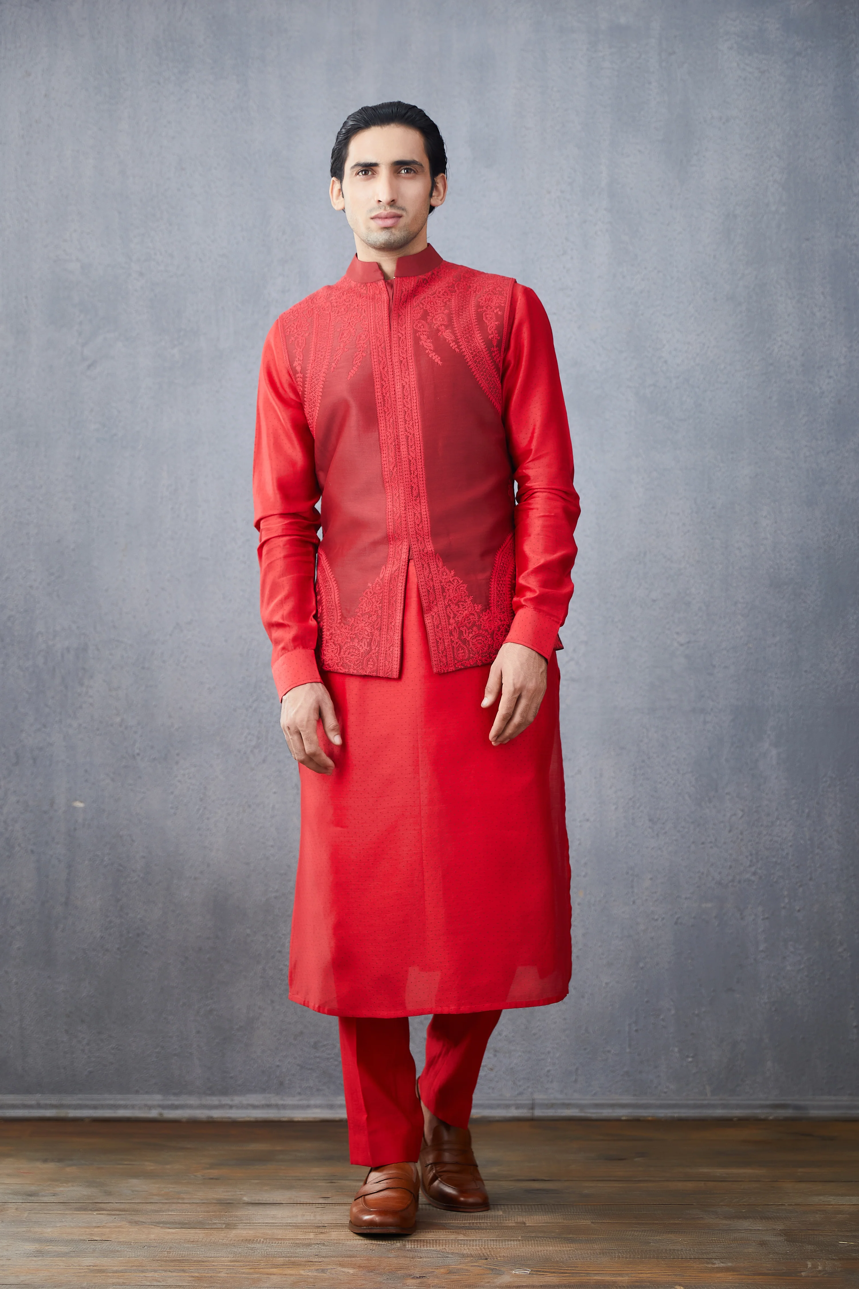 The Surkh Imam Bandi features a luxurious blend of handwoven Chanderi, Cotton Voile, and Cotton Silk fabrics. Intricate details like Dori Embroidery, Hand Adda Work, and Hand Block Print give this item a unique and luxurious touch. The deep red hue further adds a touch of elegance.