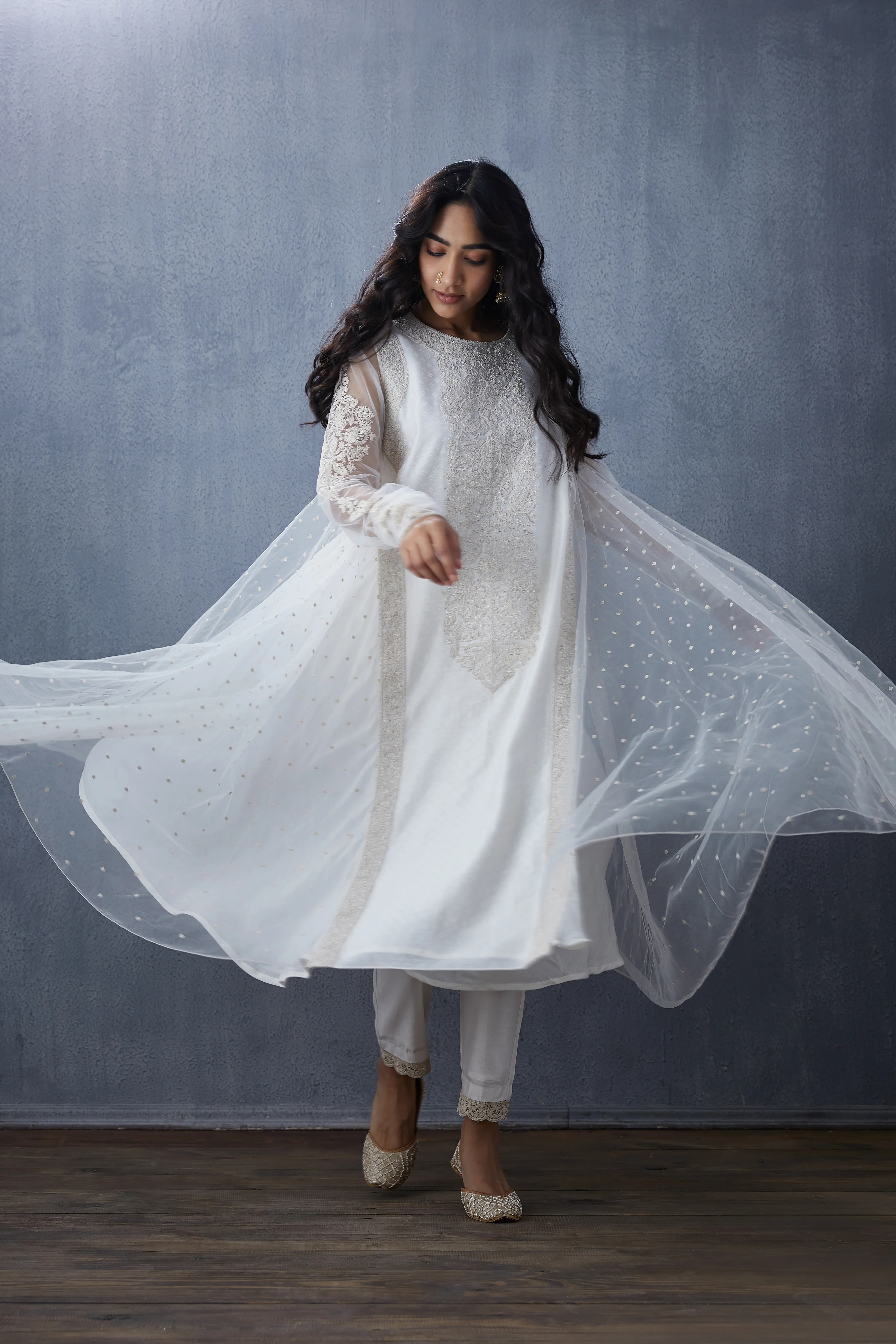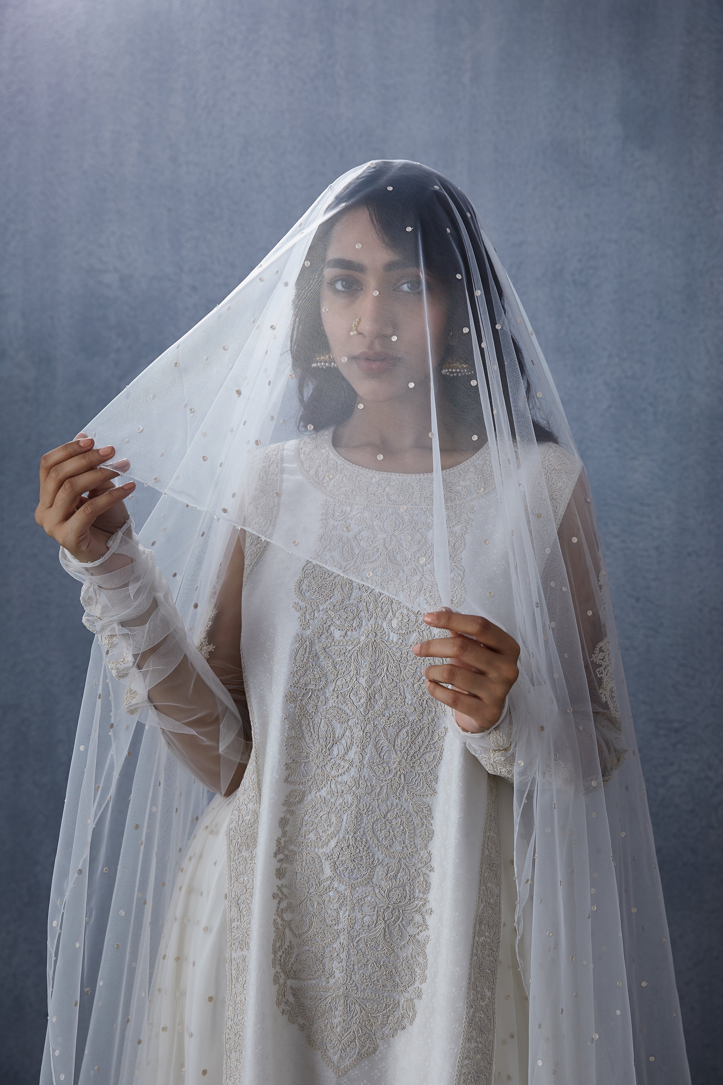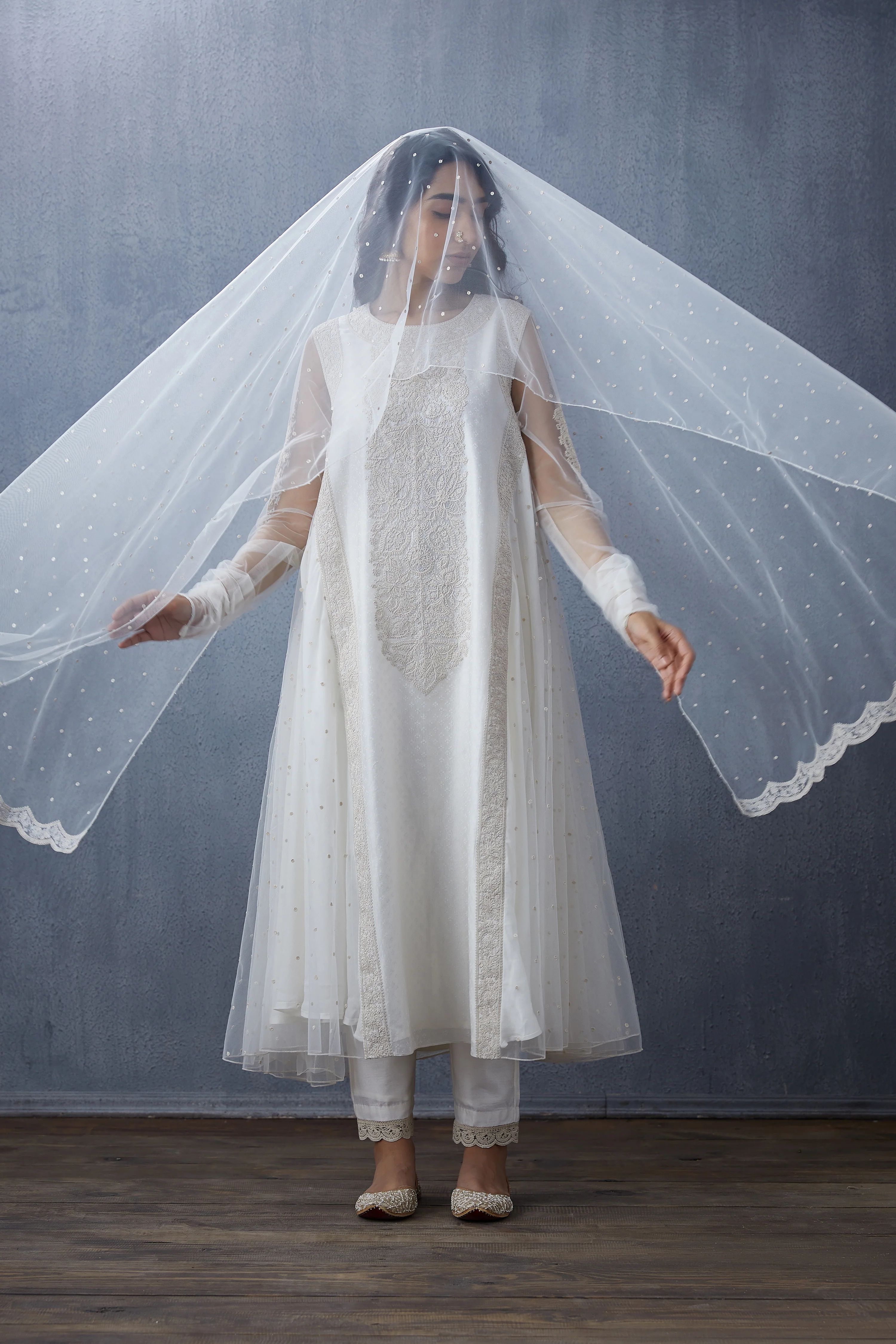This Swetah Arna Odhni is a beautiful piece of traditional ethnic wear. Crafted from Butterfly Net fabric, it is decorated with intricate Aari Embroidery work in white to create a graceful look. This Odhni is sure to wow the crowd!