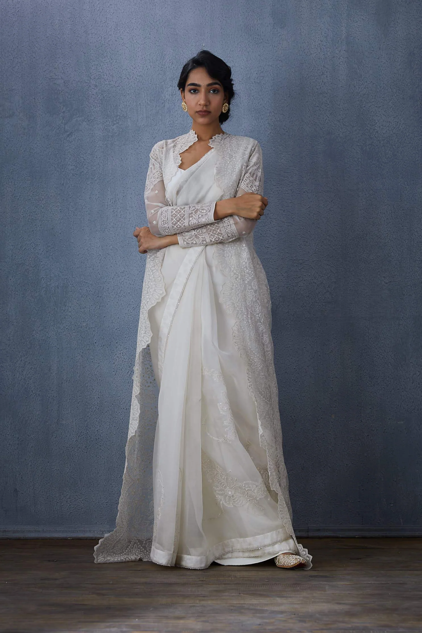 Look and feel your best in the Swetah Daavya Cape. Crafted from luxurious Silk Organza, the delicate Aari embroidery of this beautiful piece adds an elegant, timeless touch. Perfect for special occasions, the exquisite white hue will ensure you make a statement.